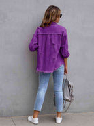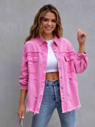 Trendsi Trends Distressed Drop Shoulder Fringed Denim Jacket. This American Denim jacket will suit every women and the fashion designer denim collection for every occasion. Featured in an assortment of colors from hot pink to lavender sizes small to 2xl.