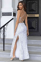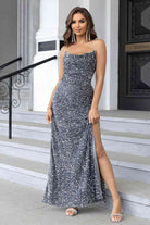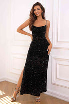Elevate your style with our Sequin Backless Split Maxi Dress. This luxurious and sophisticated choice features dazzling sequins that will catch everyone's eye. The daring backless design and bold split maxi length add an air of exclusivity and elegance to any upscale party or special occasion. Make a statement and stand out in style with this must-have piece.