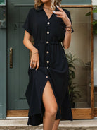 Slit Drawstring Button Up Short Sleeve Midi Dress