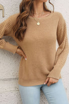 Ribbed Openwork Sleeve Round Neck Pullover Sweater