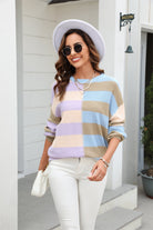 Round Neck Long Sleeve Color Block Dropped Shoulder Pullover Sweater